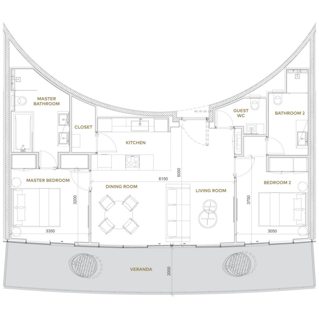 The apartment comprises an open-plan kitchen, a dining area, a living room, a covered veranda, 2 bedrooms, 2 bathrooms, and a guest toilet.