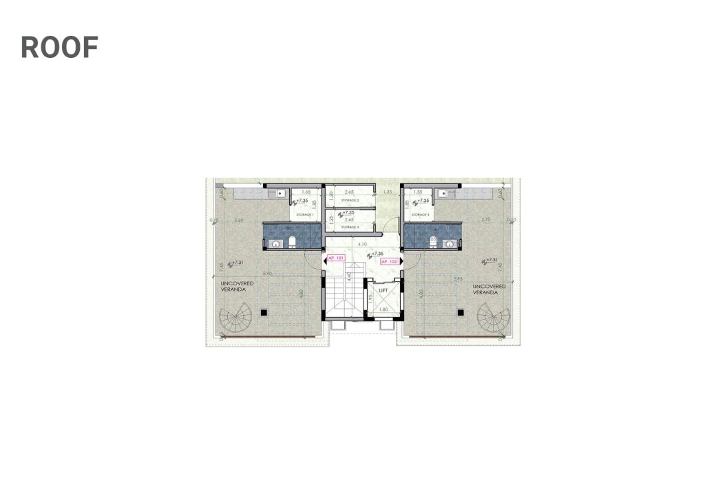 Размеры объекта: внутренняя площадь - 91 кв.м., крытая веранда - 17 кв.м., открытая терраса на крыше - 45 кв.м., крытая парковка - 11,5 кв.м., общая площадь - 7,8 кв.м.