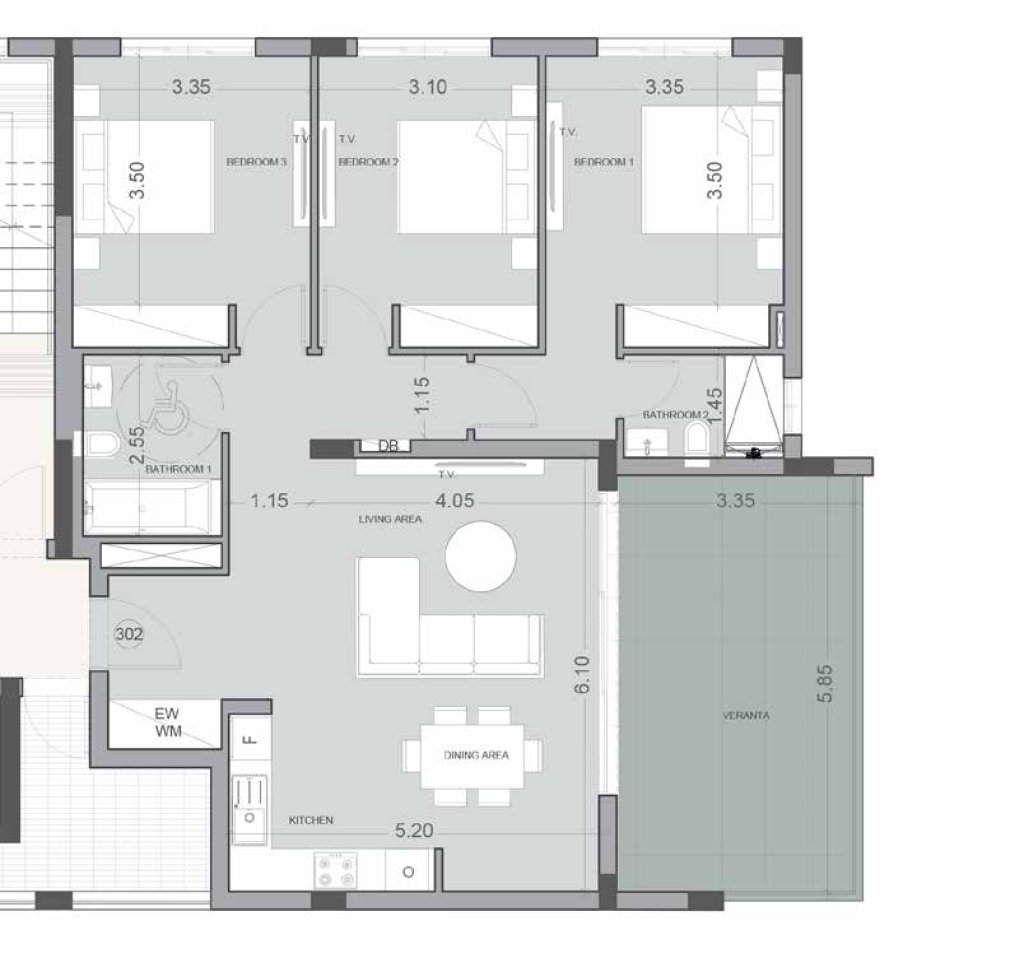 Квартира состоит из кухни открытой планировки, столовой, гостиной, крытой веранды, трёх спален и двух ванных комнат.